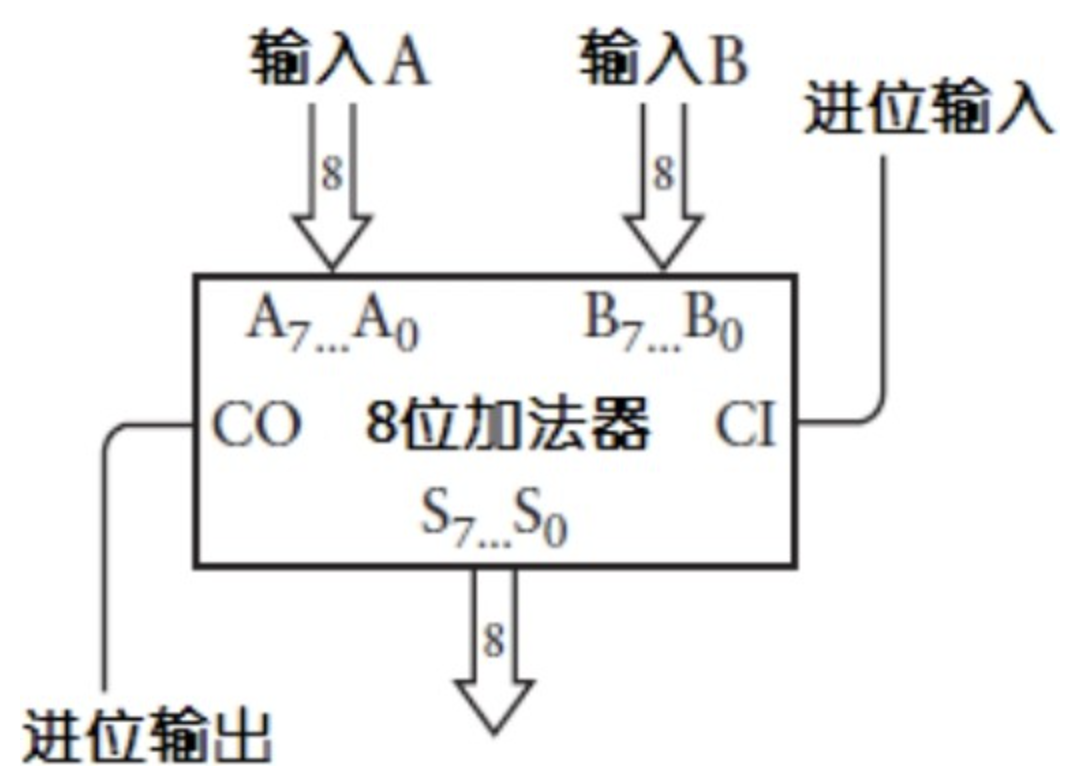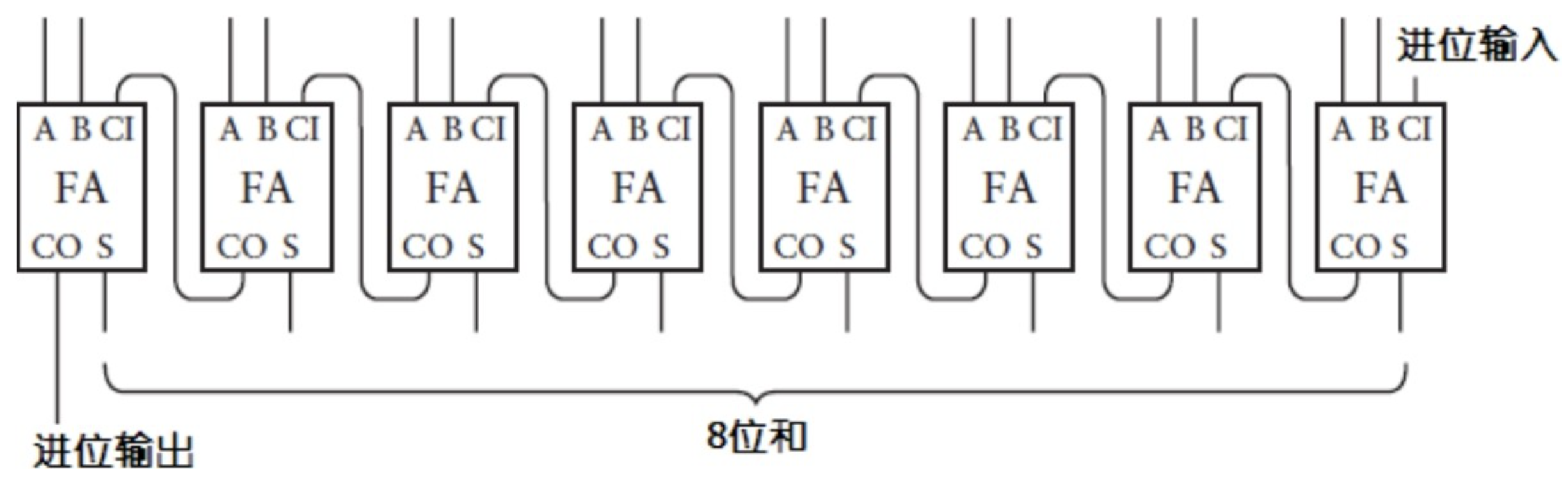 还可以用另一种方式来看这 8 个全加器的连接,每个全加器的进位输出都作为下一个全加器的进位输入: